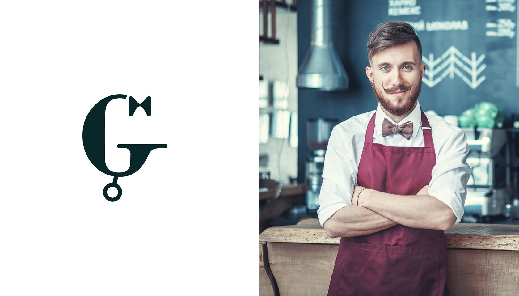Основная идея логотипа отражает специализацию бренда: основа знака — видоизмененное начертание заглавной буквы G, в которой четко прослеживается поднос на руке официанта, а окончание буквы трансформировано в бабочку.